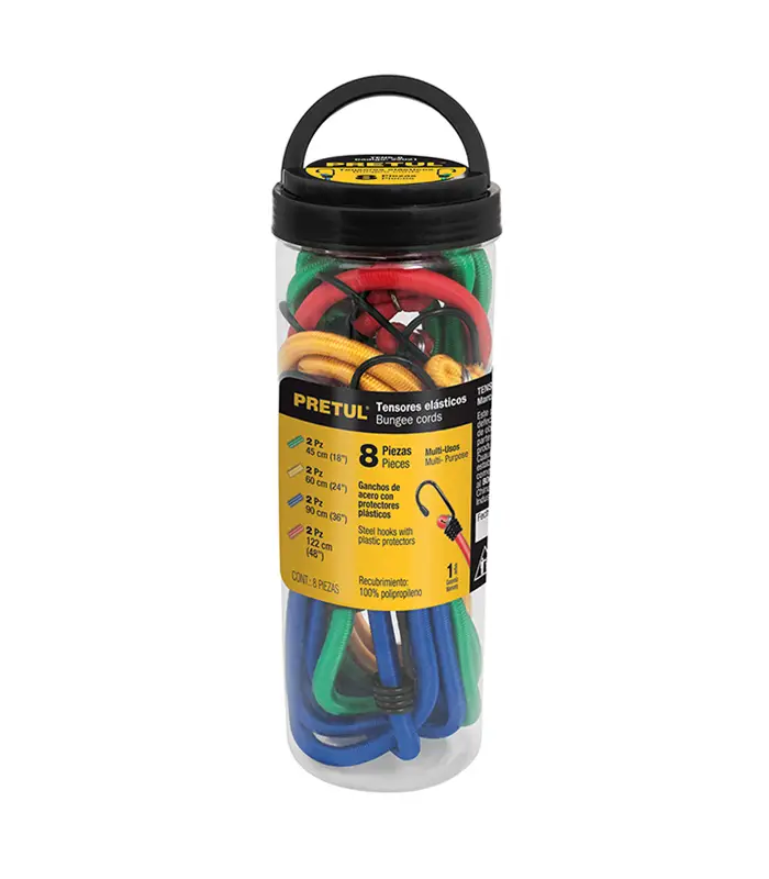 Juego de 8 tensores elásticos PRETUL con ganchos metálicos. Ideales para asegurar cargas ligeras en auto, hogar o camping.